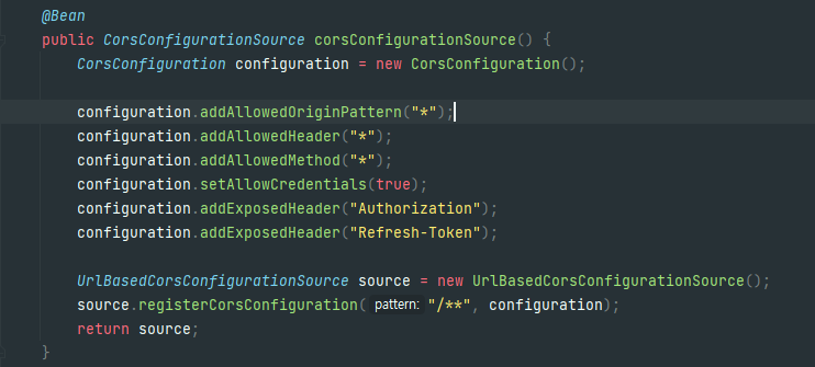 프로젝트를 진행하면서 여러문제가 있었지만 가장 큰 문제는 서로 다른 서버를 통신하는 것이였다. 처음에는 프론트엔드에서 백엔드 서버로 요청을 하게되면 그냥 무난하게 데이터를 가져올 수 있을줄 알았다. 하지만 CORS 문제가 발생하였다.그래서 이 문제를 해결하는데에 백엔트, 프론트엔드 어디서 처리해줘야 할지 몰랐었다. 그래서 구글링을 해보니 벡엔드 서버에서 CORS 문제를 해결 할 수 있는 방법이 있어 벡엔드에서 처리를 아래와 같이 해주었다.