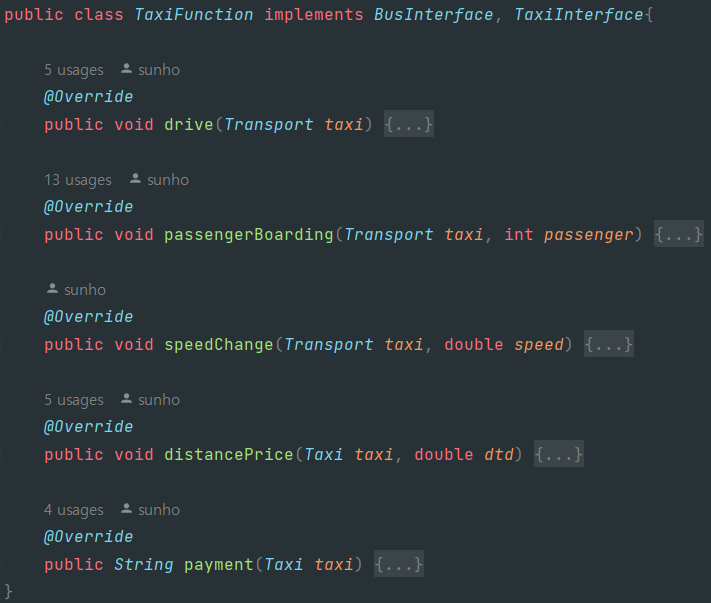 그리고 Bus와 같이 TaxiFunction 클래스에 인터페이스를 적용시켰다.