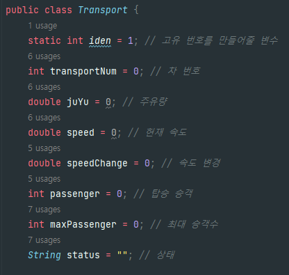 먼저 부모 객체인 Transport 라는 객체를 만들어 주었다.