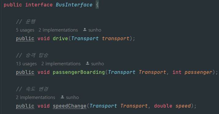 위의 코드는 BusFunction이라는 클래스를 하나 만든 후 implements를 통해 인터페이스를 적용한 코드이다.