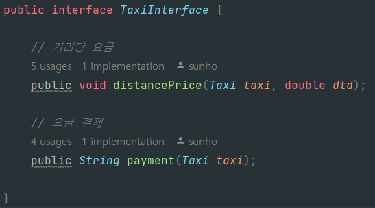 다음은 Taxi에 관한 기능을 인터페이스 통해 만들었다.